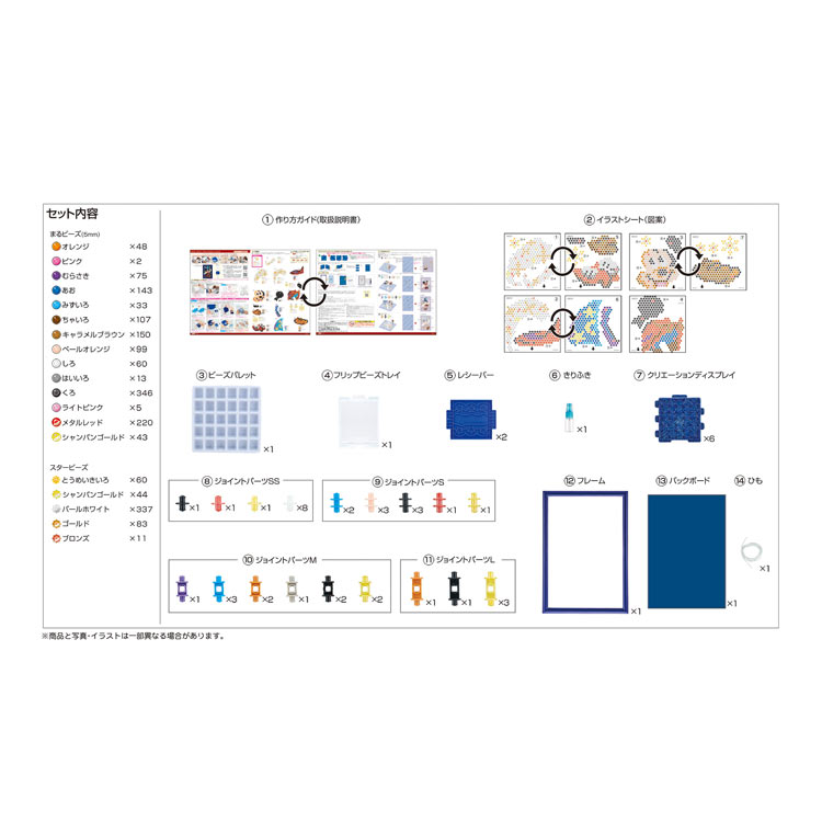 作り方ガイド(取扱説明書)、イラストシート(図案)、ビーズパレット x1、フリップビーズトレイ x1、レシーバー x2、きりふき x1、クリエーションディスプレイ 各種、ジョイントパーツ 各種